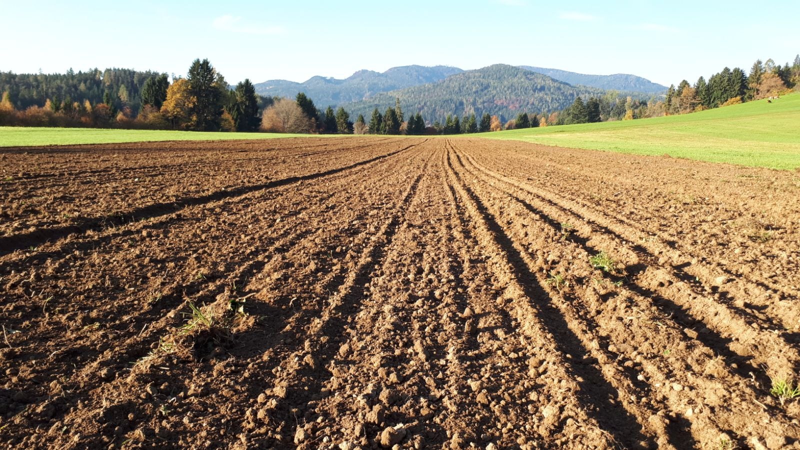 Unsere Felder werden mit dem natürlichen Mist unserer Tiere und Kompost aus der hauseigenen Kompostieranlage gedüngt. Indem wir mit leichten Maschinen den Boden bearbeiten wird eine Bodenverdichtung vermieden – somit kann der Regenwurm geschont und kann seine Arbeit verrichten.